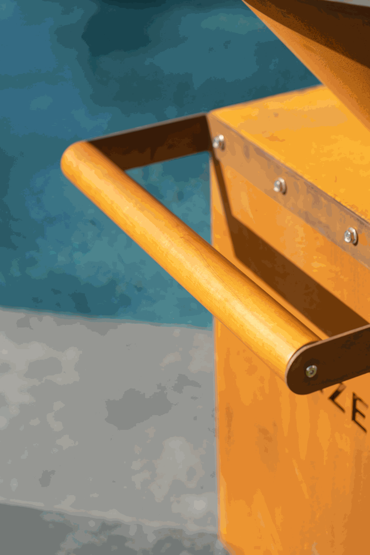 Une fois la poignée installée, vous pouvez fixer le support en bois à la base métallique. Ce support est équipé de petites vis préinstallées dans le bois, permettant de l’attacher facilement à la structure métallique.