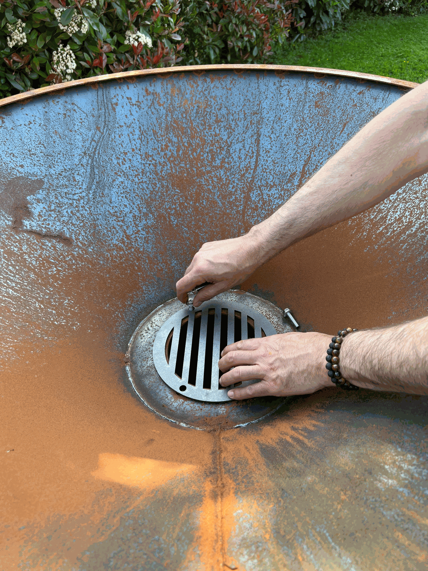 • Localisez la vis déjà présente à l’intérieur de la poignée du couvercle en acier corten.
